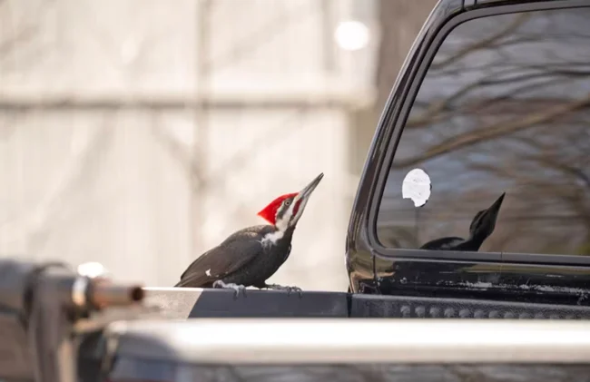 «Девушка» оказалась пола мужского, да еще и в брачный период. Местный дятел, видя свое отражение в зеркалах и стеклах машин, принимал их за потенциальных конкурентов и просто защищал свою территорию