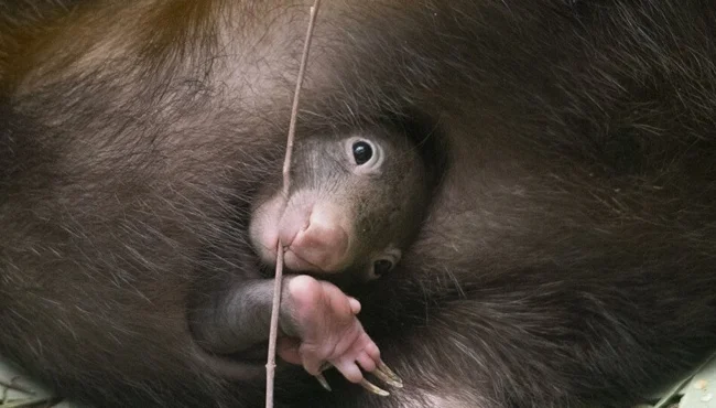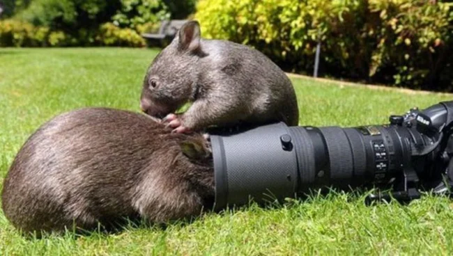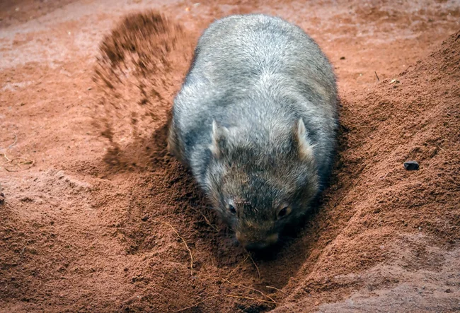 В отличие от кенгуру, сумка вомбата открывается назад — так в неё не попадает земля при рытье нор. Детёныш (размером с фасолинку!) проводит в сумке 6–10 месяцев, прежде чем выбраться наружу.