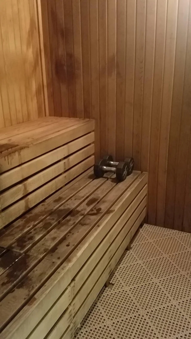 Помните гантели, оставленные в раздевалке? Кто-то и вовсе оставил их В САУНЕ