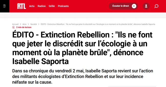 Движение Extinction Rebellion («Восстание против вымирания») обычно организует зрелищные акции, часто незаконные, но ненасильственные, такие как блокирование дорог, захват общественных мест или нанесение символического ущерба.