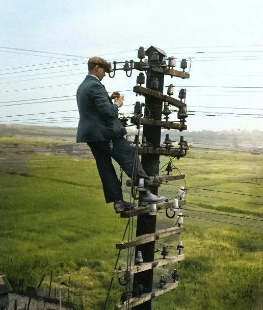 Линейный монтер, работающий на электрическом столбе, 1920-е. ![]()