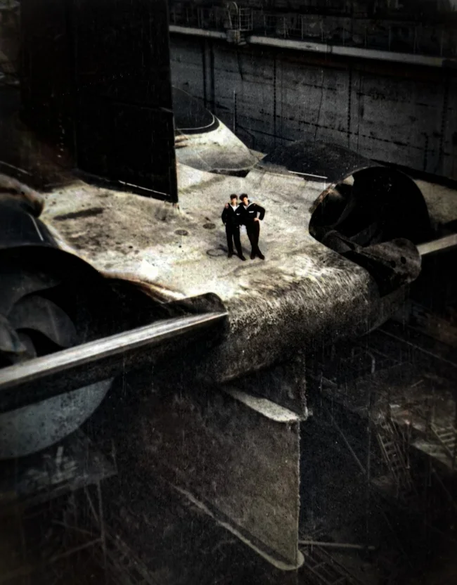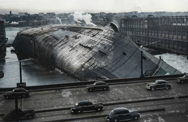 Французский турбо-электроход «Нормандия», сгоревший и опрокинувшийся у пирса в Нью-Йорке, 1942 год.