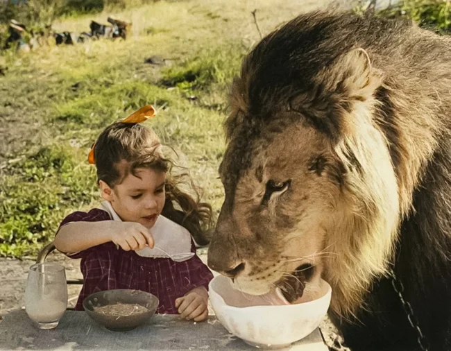 Маленькая девочка завтракает со львом, год съемки неизвестен.
