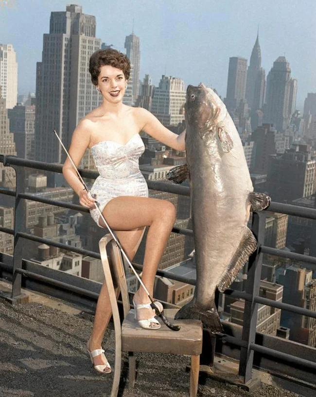 Победительница и признанная королева сомов Гейл Хупер из штата Теннесси держит сома весом в 25 кг в отеле New Yorker, 1945 год.
