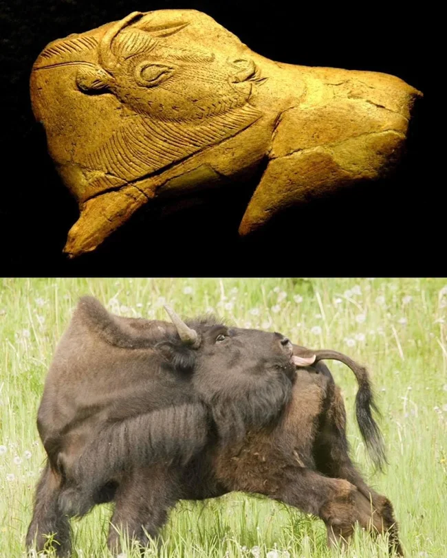 3. «Бизон, вылизывающий укус насекомого». Изделие из оленьего рога было обнаружено во время раскопок во Франции. Возраст находки — 14 000 лет