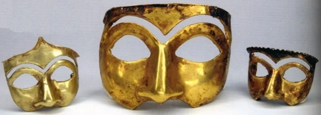 30. Золотые маски, найденные в пещере Калмакарех в Лорестане, Иран. Датируются первой половиной первого тысячелетия до н.э. и хранятся в Национальном музее Ирана ![]()