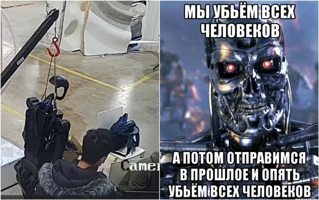 Подвешенный на крюке человекоподобный робот Unitree H1 внезапно начал размахивать руками, людям даже пришлось отбежать на безопасное расстояние. Из-за резких движений упал компьютер, через который велось управление, однако и после этого машина не унималась.