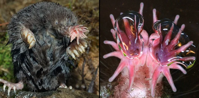 Слева — сам крот-звездонос. Справа — то, как его нос работает под водой.