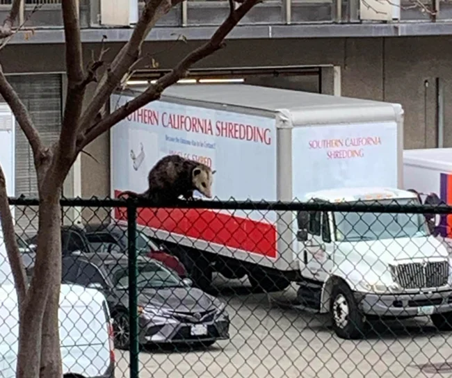 Этот опоссум так удачно сидит на заборчике, что очень хорошо вписался в кадр с автомобилем
