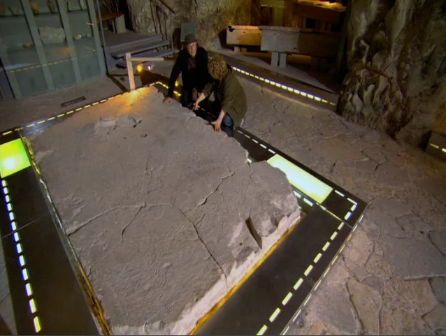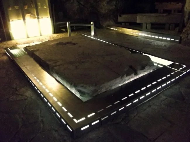 Когда её обнаружили в 1960-х, рабочие решили, что перед ними застывший бетон. Попытка сдвинуть плиту бульдозером провалилась — она оказалась неподъёмной. Так артефакт и остался лежать на месте, став частью музейной экспозиции.