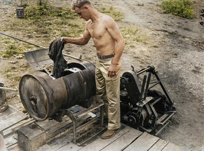Американский танкист Уолли Раджиб стирает белье на самодельной стиральной машине. Новая Гвинея, 1942 год.