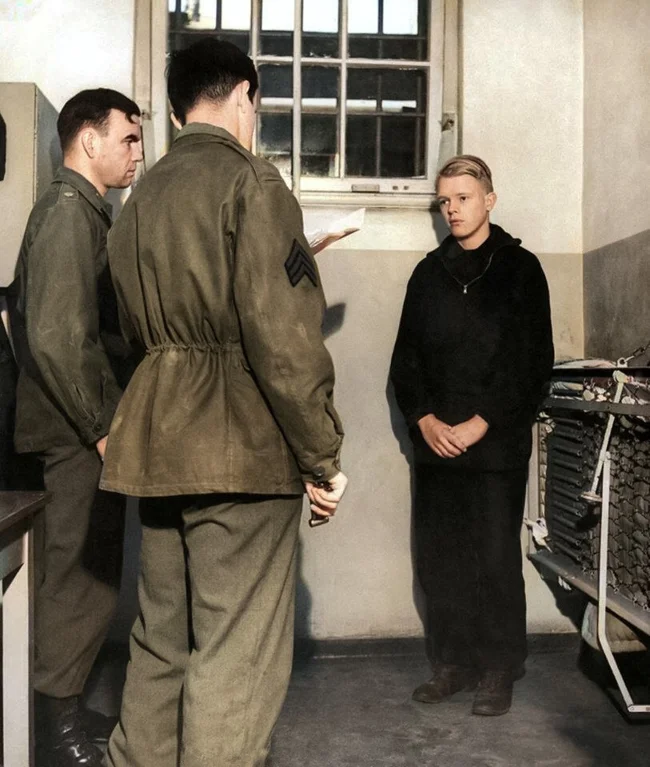 16-летний член Гитлерюгенда К. Пунцеллер слушает американского сержанта, зачитывающий приговор о пожизненном заключении за военные преступления, 1945 год.