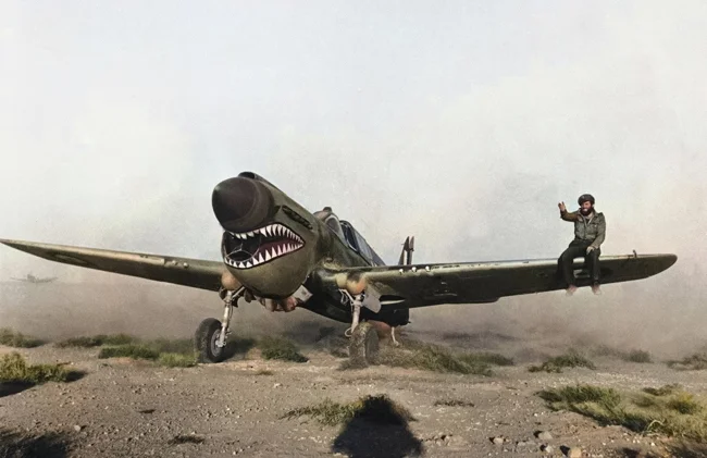 Авиамеханик, указывая направление движения, оказывает помощь пилоту истребителя Кертисс Р-40 «Киттихок» (Curtiss P-40 Kittyhawk Mk.I) 112-й эскадрилье Королевских ВВС Великобритании (No. 112 Squadron RAF) «Sharknose» в маневрировании на пустынном аэродроме в Северной Африке. 1942 год.