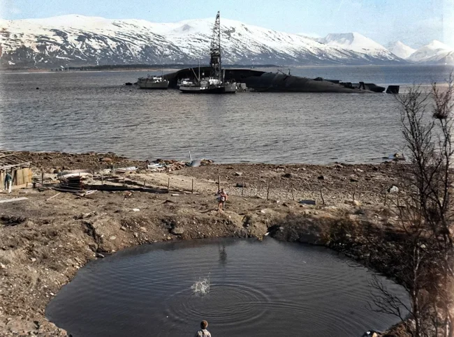 Норвежские дети играют у воронки от бомбы на фоне затонувшего линкора «Тирпиц», 1949 год.