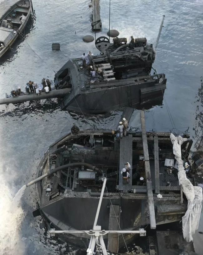 Демонтаж башен главного калибра с потопленного 7 декабря 1941 года в результате японской атаки Пёрл-Харбора американского линкора «Аризона» (USS Arizona, BB-39).
