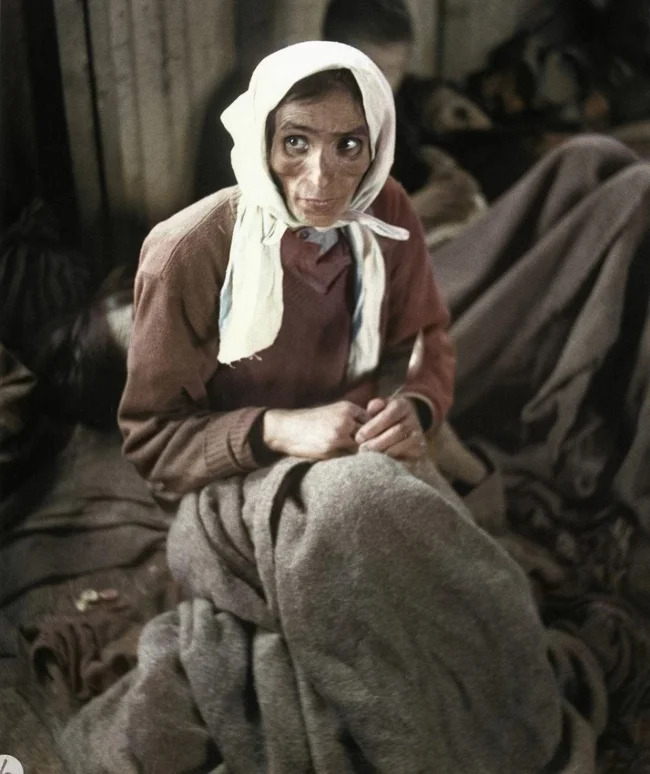 Цыганка, больная тифом в концентрационном лагере Берген-Бельзен, вместе с другими цыганами ждет медицинской помощи, апрель 1945 года.