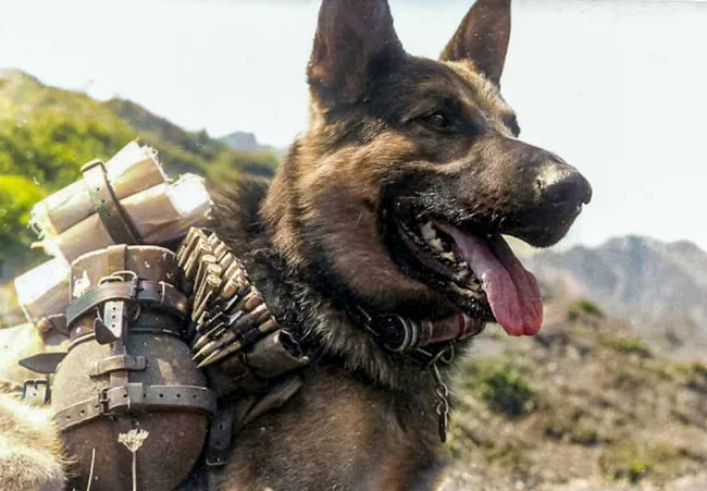 Немецкая служебная собака, на которую нагружены фляга, бинты и патроны, 1939-1945 год.