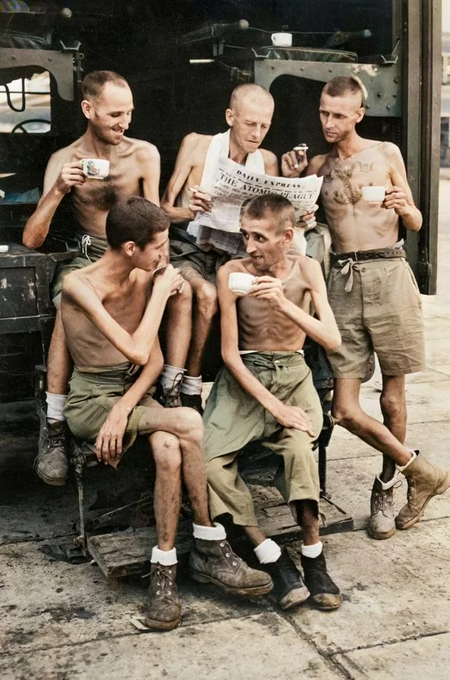 Британские солдаты после освобождения из японского плена в Сингапуре, 1945 год.