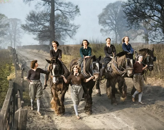 Женщины, медленно возвращаются с полей фермы под Эпсомом, что в графстве Суррей. Это не просто сельхозработники — это участницы Женской сухопутной армии (Women's Land Army) , отряд которой стал символом женского вклада в британское тыловое усилие во времена Второй мировой войны.