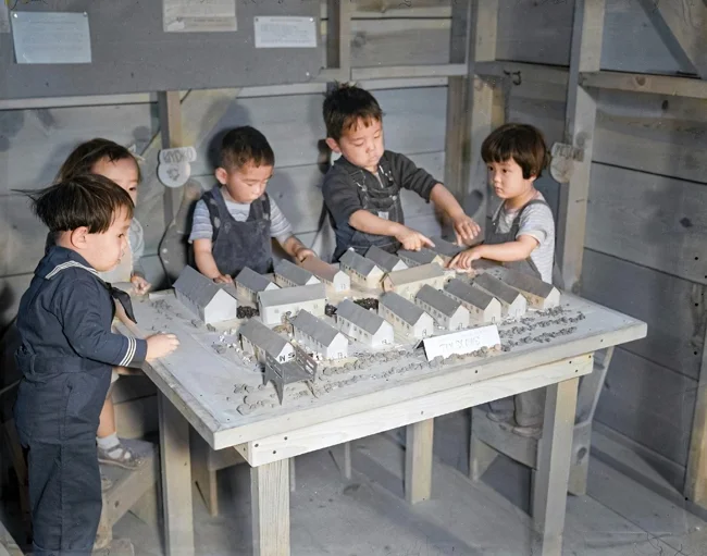 Дети интернированных японцев играют макетами своих бараков в центре перемещения «Tule Lake». США, штат Калифорния, 1942 год.