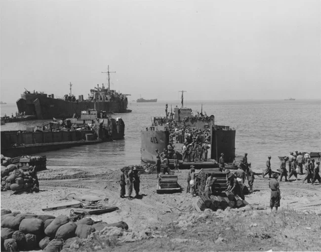 Транспорт USS Boone County (крайний слева у пирса) высаживает войска на Сицилии, 1943 год. В мае 1960 переименован в Lesvos и передан Греции. В 1974 году запустил цепочку событий, приведших к сражению у Пафоса