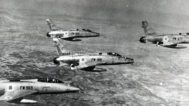 Эскадрилья турецких истребителей-бомбардировщиков F-100 в небе над Кипром, 1974 год