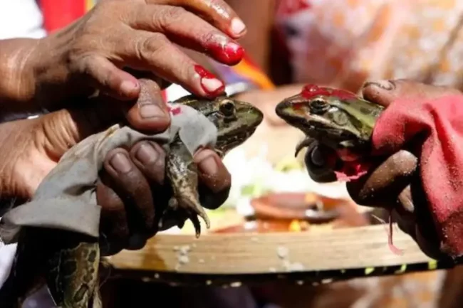 Под монотонные мантры жрецов лягушки, олицетворяющие Индру, бога дождя, и Притхви Деви, богиню Земли, восседают на особом помосте и даже «обмениваются» цветочными гирляндами. Кульминация — священный узел, которым их соединяют на время ритуала.