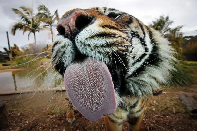 Мало того, что у тигра клыки как кинжалы, так его язык ещё и усеян острыми ороговевшими сосочками, загнутыми назад, словно микроскопические шипы. Это природное приспособление работает как тёрка – отлично счищает мясо с костей добычи, быстро снимает шкуру и перья одним движением, работает как грубая щётка при вылизывании.