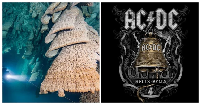 Здесь, в узком шестиметровом слое пещеры, напоминающей песочные часы, свисают с потолка необычные сталактиты. Они не похожи на привычные заострённые сосульки — эти образования полые, конические, напоминающие то ли колокола, то ли абажуры. Дайверы прозвали их «Адскими колоколами» — в честь хита легендарной австралийской группы AC/DC.