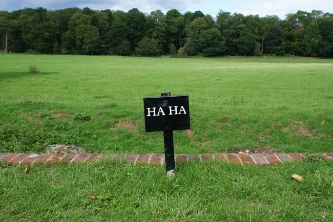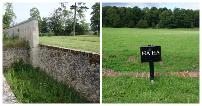 Ха-ха — это хитроумное сочетание рва и стены. Снаружи он выглядит как пологий травяной склон, резко срывающийся вниз, а со стороны усадьбы — как вертикальная каменная стена, верхний край которой вровень с землёй. Такая конструкция не позволяла скоту забрести на аккуратный газон, но при этом не нарушала великолепный вид из поместья. Глядя из окон дома, можно было подумать, что сад бесконечно сливается с природой — стена оставалась практически незаметной.
