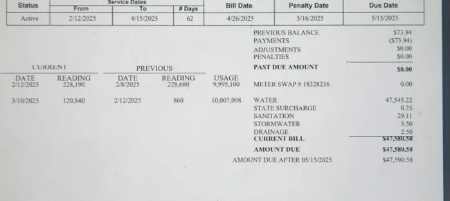 Когда 35-летний Эшли Хадспет из пригорода Оклахома-Сити увидел счет за воду, то решил, что произошло недоразумение. В графе к оплате значилось: $47 580,58 — сумма, которая превышала его обычные расходы почти в 600 раз. Обычно он платит около 70 долларов, но в этот раз якобы потратил более 10 миллионов галлонов воды за 62 дня (объем, достаточный, чтобы наполнить 15 бассейнов олимпийского размера).