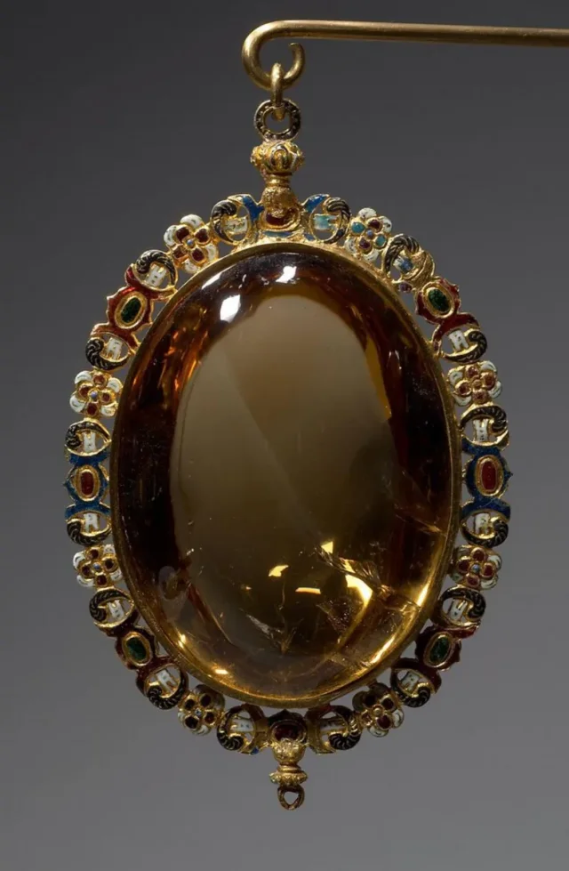 Изделие из золота и эмали, украшенное овальным цитрином (желтая разновидность кварца). XVI век н.э. Посмотреть его можно в Императорском казначействе в австрийской Вене ![]()