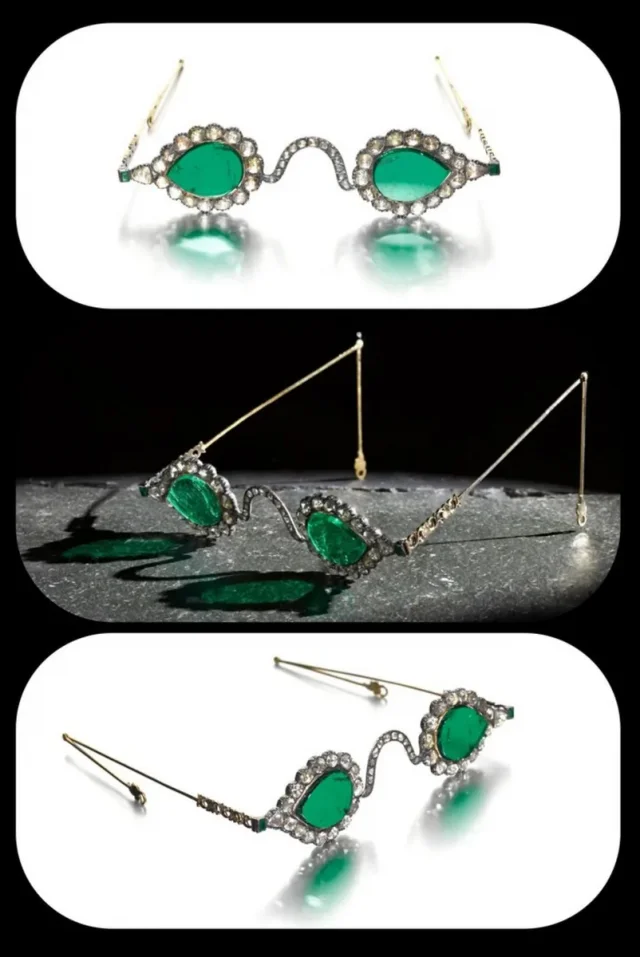 Необычный очки, названные вратами рая, времен Империи Великих Моголов, около 1630-1660 гг. н. э. Для изготовления линз использовали изумруд весом 300 карат, а добыли его на шахте в Колумбии