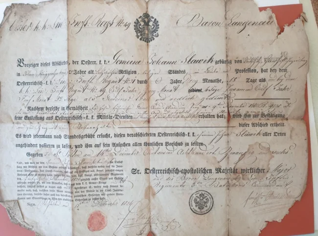 Этим официальным письмом, богемский солдат Иоганн Славик был освобожден из армии, после того как прослужил одиннадцать с половиной лет. Это Австрийская империя. Датировано декабрем 1826 года. Оно служило еще пропуском и как рекомендация. 33 года. Не женат. Католик. Здесь также указали место, где он родился и профессию. Ему не полагались выплаты, связанные с инвалидностью, или какое-либо другое пособие. В дальнейшем тексте указана инвалидность, полученная им перед освобождением от службы. Все самое интересное написано от руки, но моей расшифровке не поддается.