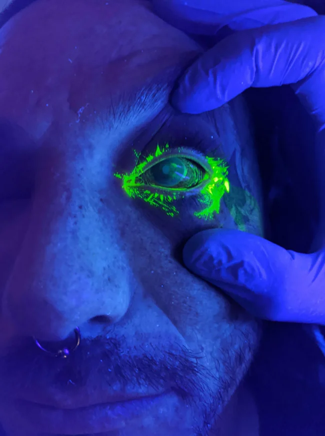 Благодаря флуоресцентным глазным каплям специалисты видят царапины на роговице. С этим парнем произошел несчастный случай на заводе