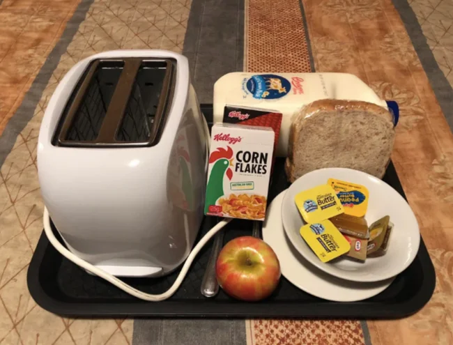 8. В мире пандемия коронавируса и завтрак в номер в отеле выглядит вот так — продукты, плюс тостер, плюс нераспакованная емкость с молоком