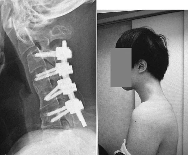 Однако, поскольку пациент жаловался на онемение при ношении устройств, данное лечение было прекращено. Решили проблему сурово, провели парочку операций, удалили лишнее, вкрутили ему в шею ряд винтов и металлических стержней, чтобы исправить осанку.