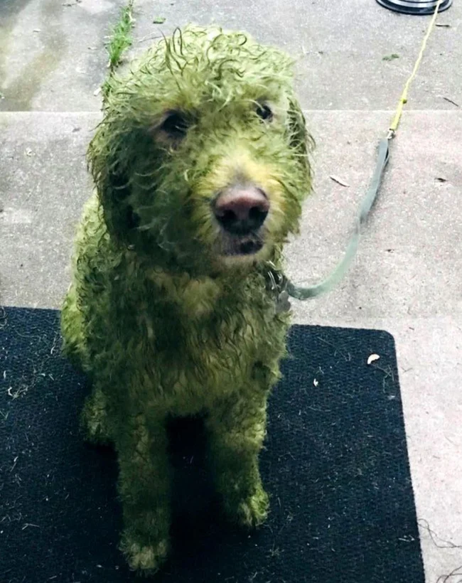 Когда белая собака гуляет по двору, где только что была пострижена лужайка