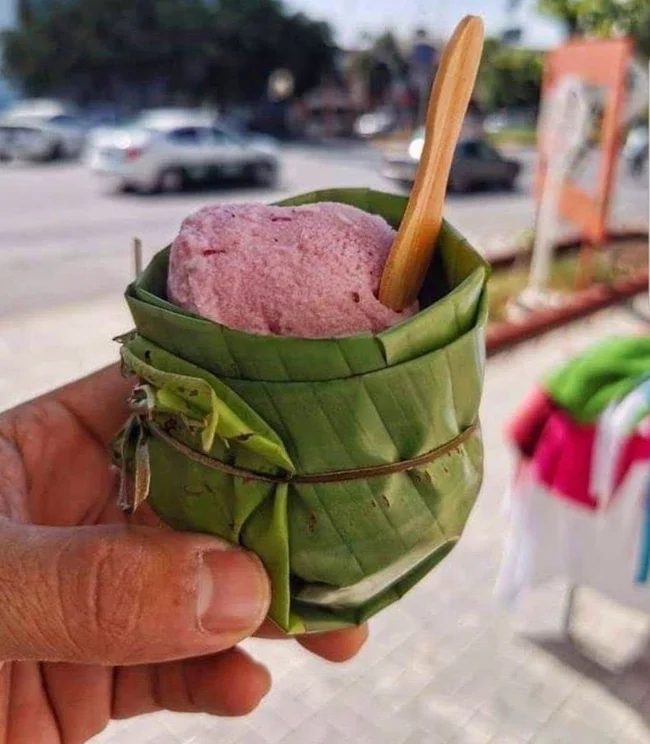 В Таиланде мороженое продают в листке банана, который закреплен лианой
