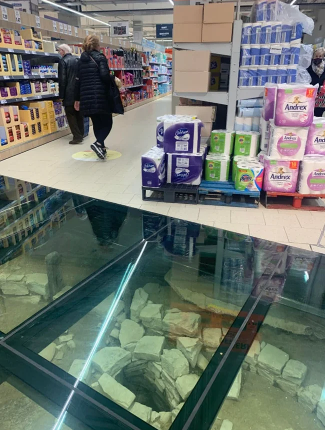 Когда в Ирландии строили супермаркет, случайно попали на древний объект викингов, которые раньше жили в этом месте. Теперь в магазине есть участок с этим объектом