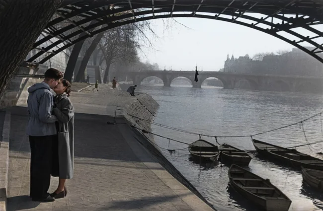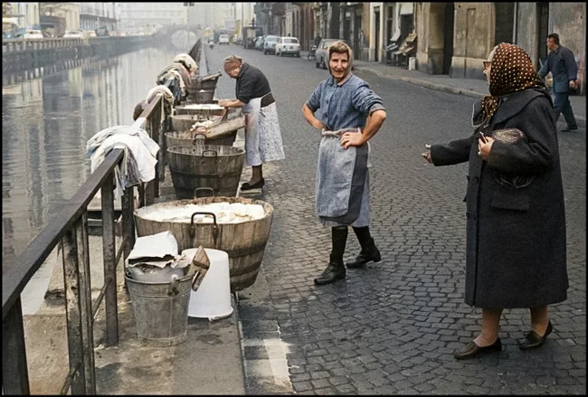 Каналы Милана ещё помнили времена, когда жизнь текла рядом с водой — буквально. Здесь стирали, мыли овощи, полоскали тряпки, а порой даже черпали воду для дома. И хотя это был уже 1966 год, эпоха перемен, для многих женщин прачечная под открытым небом оставалась частью быта и общения. Мост Искусств. Париж, 1952 год.