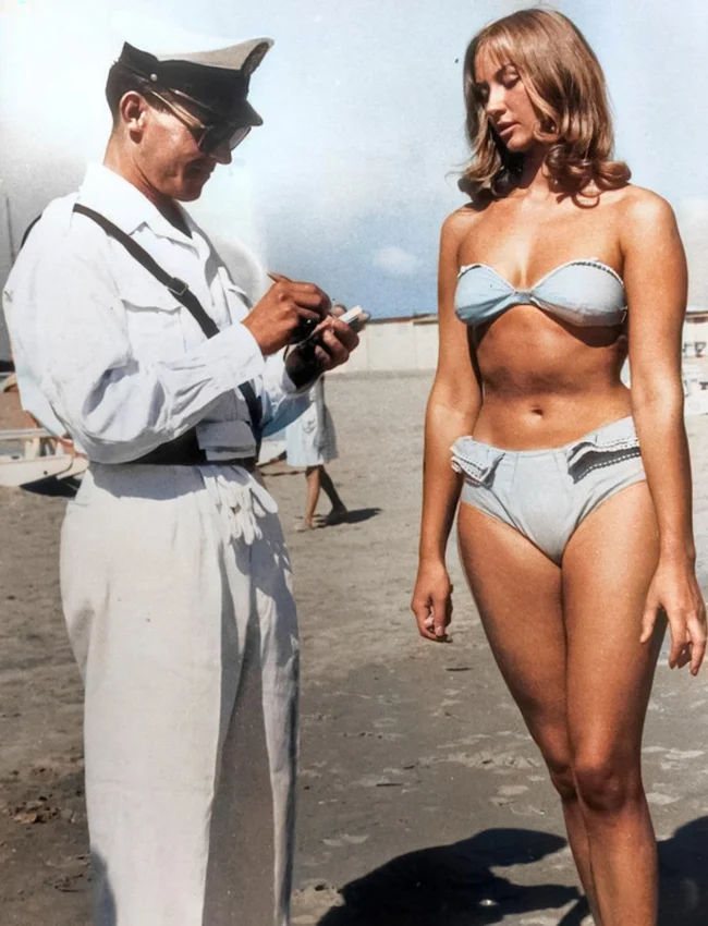 Полицейский выписывает штраф за ношение бикини на пляже в Римини, Италия, 1957 год. ![]()