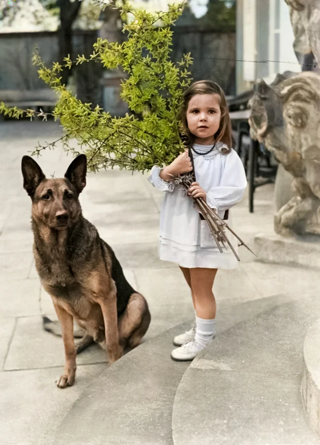 Хельга Геббельс c собакой Адольфа Гитлера, 1937 год. На этом фото — Хельга Геббельс, старшая дочь Йозефа и Магды Геббельс, с собакой Адольфа Гитлера по кличке Блонди. Немецкая овчарка была постоянным спутником фюрера и часто появлялась рядом с семьёй Геббельсов, как на официальных встречах, так и в повседневной жизни. У министра пропаганды было 6 детей, всех их он и его супруга забрали на тот свет когда Красная армия вошла в Берлин.