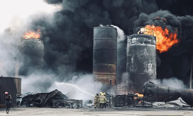 На кадрах, опубликованных в социальных сетях, виден мощный взрыв, за которыми последовало пламя и густой черный дым. Также видны горящие топливные контейнеры. Операция по тушению пожара продолжается.
