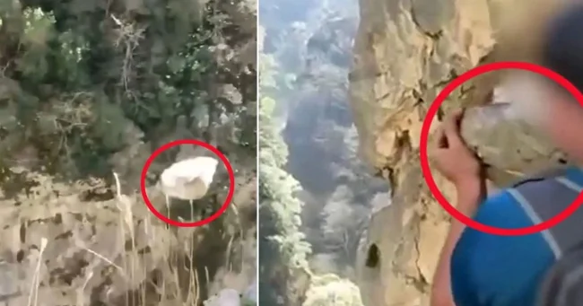 Друг путешественника запечатлел сомнительное развлечение на популярной тропе Карес в национальном парке "Пики Европы" на севере Испании. Мужчина хватает глыбу и бросает в ущелье, а через несколько секунд раздаётся оглушительный звук.