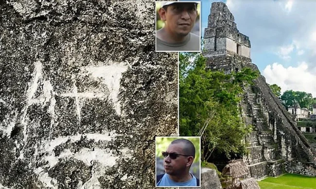 6. Двое туристов выцарапали свои инициалы на стене древнего храма Тикаль в северной Гватемале