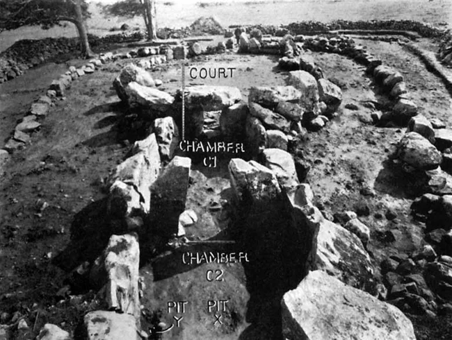 Кривикил обладает всеми чертами классической гробницы с двором: ориентацией с севера на юг и остатками каменной насыпи.