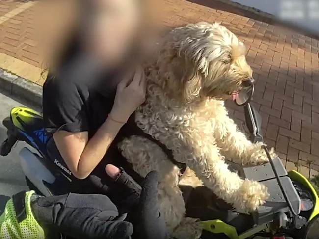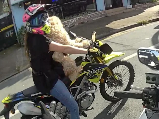 Полицейский из Квинсленда (Австралия) остановил мотоциклистку, которая везла с собой собаку. При этом способ транспортировки был неприемлемым.