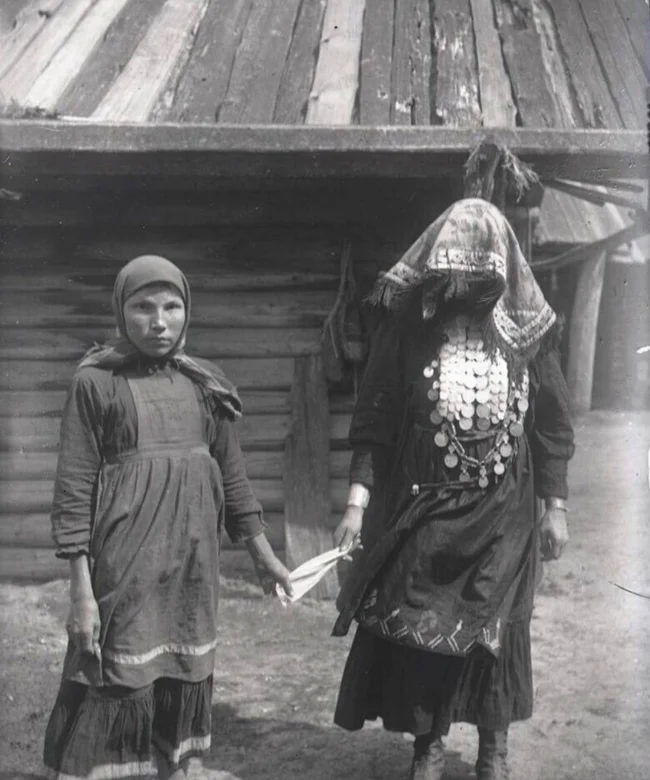 Одна из них невеста, а вторая сестра жениха. Вторая ведет первую на речку, где невесту будут обливать согласно обряду, Удмуртия, 1930-й