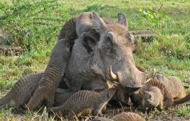 Кстати, в одном нам Дисней не соврал: у бородавочников в саванне действительно есть друзья. Только это не сурикаты, а мангусты. Проворные зверьки чистят шерсть кабанов маленькими лапками, а те взамен помогают мангустам искать еду, переворачивая большие брёвна и раскапывая ямы. И все довольны!